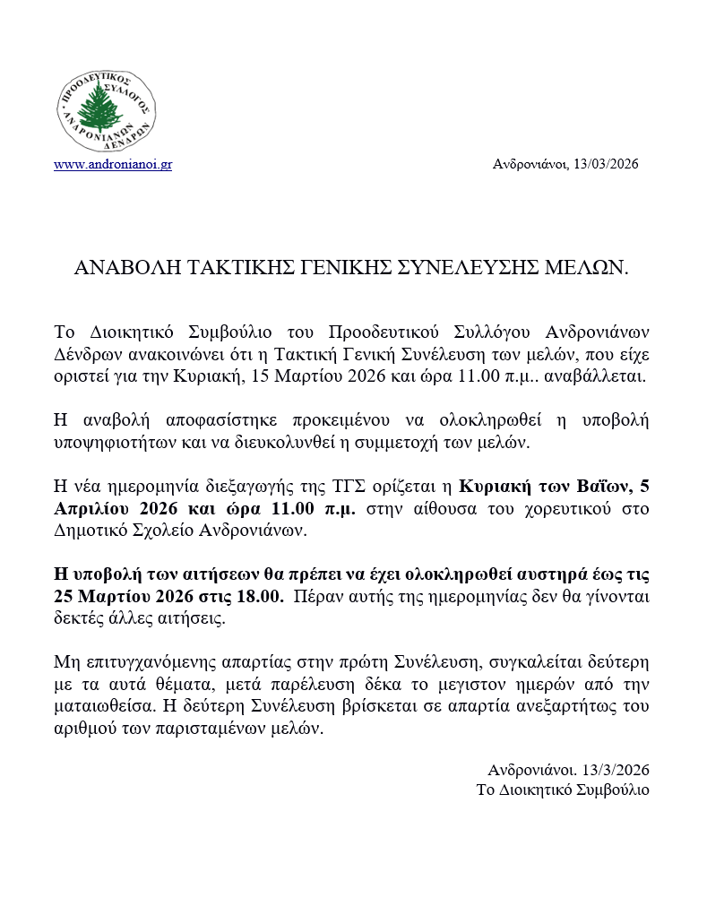 Το Διοικητικό Συμβούλιο του ΠΡΟΟΔΕΥΤΙΚΟΥ ΣΥΛΛΟΓΟΥΑΝΔΡΟΝΙΑΝΩΝ – ΔΕΝΔΡΩΝ, ανακοινώνει πως μετά από ομόφωνη απόφασή του, από το μεθεπόμενο φύλλο της εφημερίδας μας δηλ. το Νο 98 του Α’ τριμήνου 2016 και για λόγους της οφειλόμενης εκκαθάρισης του αρχείου παραληπτών της: